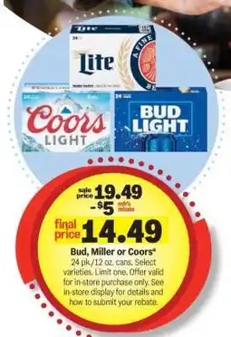 1Meijer Bud, Miller or Coors offerBud, Miller or CoorsMeijer$14.4918 February 202624 February 2026 View offer