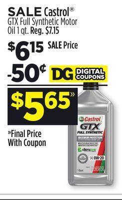![]() | Castrol® gtx® full synthetic motor oil | Dollar General | $6.65 | 25 June 2023 | 01 July 2023 | ||