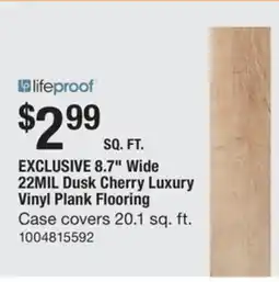 | Lifeproof Dusk Cherry 22 MIL x 8.7 in. W x 48 in. L Click Lock Waterproof Luxury Vinyl Plank Flooring (20.1 sqft/case) | The Home Depot | $65.99 | 08 August 2024 | 15 August 2024 | |||