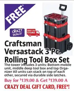| Craftsman ersastack 3 Pc. Rolling Tool Box Set | Ocean State Job Lot | $139.00 | 11 December 2025 | 17 December 2025 | |||