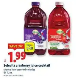 1Lidl Solevita cranberry juice cocktail offerSolevita cranberry juice cocktailLidl$2.75$1.99Save 76¢14 January 202620 January 2026 View offer