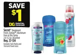 Dollar General Secret Deodorant Fresh, Outlast TM, Aluminum Free or Dry Spray offer