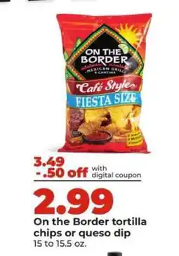 10Hy-Vee On the Border tortillachips or queso dip offerOn the Border tortillachips or queso dipHy-Vee$3.48$2.99$0.49 Discount13 April 202619 April 2026 View offer