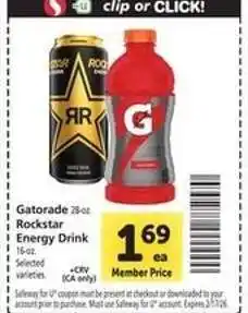 2Safeway Gatorade / Rockstar Energy Drink offerGatorade / Rockstar Energy DrinkSafeway$1.6911 February 202617 February 2026 View offer