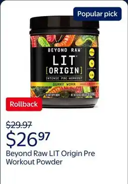 Walmart Beyond Raw LIT Origin Pre Workout Powder, Gummy Worm, for Men & Women, Energy & Pumps, 30 Servings offer