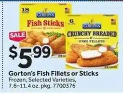 7Stop&Shop Gorton's Fish Sticks or Fillets offerGorton's Fish Sticks or FilletsStop&Shop$10.4910 April 202607 May 2026 View offer
