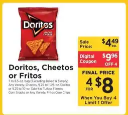 Jewel-Osco Fritos 9.25 oz., Ruffles 8 oz. or Cheetos 7-8.5 oz offerFritos 9.25 oz., Ruffles 8 oz. or Cheetos 7-8.5 ozJewel-Osco$4.9910 December 202516 December 2025