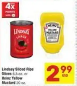 1Albertsons Lindsay Sliced Ripe Olives or Heinz Yellow Mustard offerLindsay Sliced Ripe Olives or Heinz Yellow MustardAlbertsons$2.9911 February 202617 February 2026 View offer