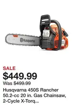 | Husqvarna 450S Rancher 50.2-cc 20 in. Gas Chainsaw, 2-Cycle X-Torq Engine | Tractor Supply Company | $499.99 | $449.99 | $50.00 Discount | 28 April 2026 | 04 May 2026 | |