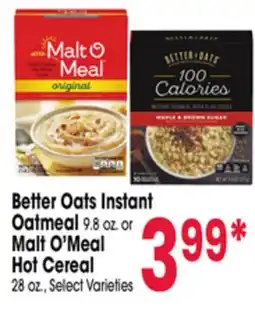 Better Oats Instant Oatmeal 9.8 oz. or Malt O'Meal Hot Cereal 28 oz