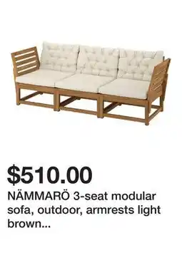 | NÄMMARÖ Sectional, 3-seat, outdoor light brown stained/Frösön/Duvholmen beige | Ikea | $600.00 | 31 March 2026 | 06 April 2026 | |||