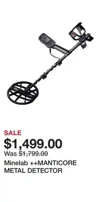 | Minelab ++MANTICORE METAL DETECTOR | Cabela's | $1,806.02 | $1,499.00 | $307.02 Discount | 27 February 2026 | 05 March 2026 | |