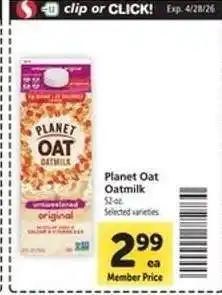 2Safeway Planet Oat Oatmilk offerPlanet Oat OatmilkSafeway$2.9922 April 202628 April 2026 View offer