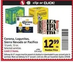 | 1 | Corona, Lagunitas, Sierra Nevada or Pacifico | Safeway | $12.99 | 18 February 2026 | 24 February 2026 | View offer | |||