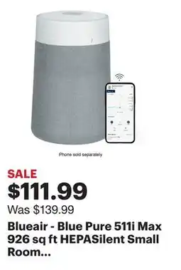 Best Buy Blueair - Blue Pure 511i Max 926 sq ft HEPASilent Small Room Bedroom Air Purifier - White/Gray offer