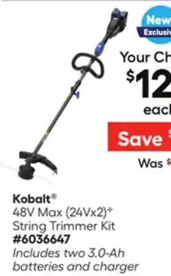 | Kobalt 48V MaxB (24Vx2) String Trimmer Kit | Lowe's | $179.00 | 09 April 2026 | 22 April 2026 | |||