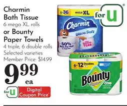 Pavilions Charmin Bath Tissue 6 mega XL rolls or Bounty Paper Towels 4 triple, 6 double rolls offer