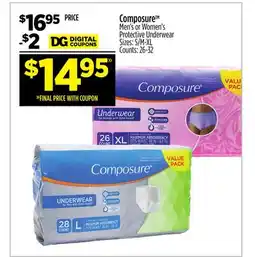 Dollar General Composure Protective Underwear Men's, Women's or Unisex Sizes: S/M-XXL Counts: 12-18 offerComposure Protective Underwear Men's, Women's or Unisex Sizes: S/M-XXL Counts: 12-18Dollar General$9.0003 August 202509 August 2025