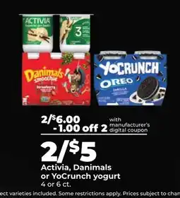 Hy-Vee Activia, YoCrunch 4 ct. or Danimals yogurt 6 ct offerActivia, YoCrunch 4 ct. or Danimals yogurt 6 ctHy-Vee$7.0024 March 202530 March 2025