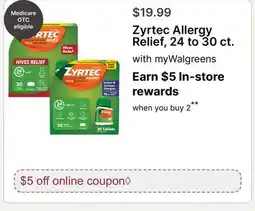| Zyrtec Allergy Relief | Walgreens | $24.99 | $19.99 | $5.00 Discount | 01 March 2026 | 07 March 2026 | |
