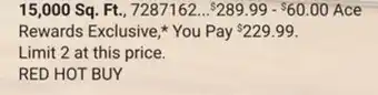 The price of 15, 000 Sq. Ft can be found at the top of the page, together with the dates during which the offer is available. You can also check the price in the current Ace Hardware flyer or on the Ace Hardware website. Promotional offers assure you of buying Ace Hardware products at the lowest price.