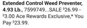 The price of Preen Extended Control Weed Preventer., 4.93 Lb can be found at the top of the page, together with the dates during which the offer is available. You can also check the price in the current Ace Hardware flyer or on the Ace Hardware website. Promotional offers assure you of buying Ace Hardware products at the lowest price.