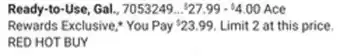 The price of Ready-to-Use, Gal can be found at the top of the page, together with the dates during which the offer is available. You can also check the price in the current Ace Hardware flyer or on the Ace Hardware website. Promotional offers assure you of buying Ace Hardware products at the lowest price.