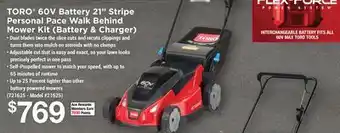 TORO 60V Battery 21 Stripe Personal Pace Walk Behind Mower Kit (Battery & Charger) deals and online offers from the current Ace Hardware weekly ad