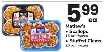 Matlaw's Scallops 15 oz. frozen, Stuffed Clams 20 oz. frozen