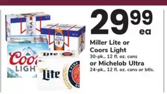 Miller Lite or Coors Light 30-pk., 12 fl. oz. cans or Michelob Ultra 24-pk., 12 fl. oz. cans or btls