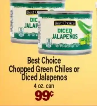 This offer is available in various stores, view all products to get the cheapest Best Choice Chopped Green Chiles or Diced Jalapenos. If you'd like to find out whether this product has a bigger discount in another store, check the category 'Grocery'. You may also find these offers interesting: 4 oz. Select Best Choice Green Chiles or Diced Jalapeños, Chopped Green Chiles & Ortega Diced Chiles or Jalapeños.