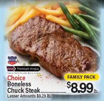 This offer is available in various stores, view all products to get the cheapest Choice Boneless Chuck Steak. If you'd like to find out whether this product has a bigger discount in another store, check the category 'Grocery'. You may also find these offers interesting: USDA Choice Black Angus Boneless Chuck Steak, U.S.D.A. Choice Boneless Beef Chuck Steak or Roast & Cut Fresh Daily USDA Choice Beef Boneless Chuck Roast or Steak.