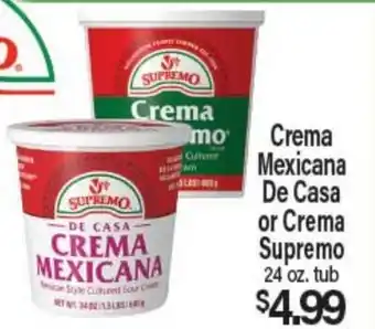 Angelo Caputo's Fresh Market offers a wide collection of products, besides the Crema Mexicana De Casa or Crema Supremo. Keep an eye on the weekly weekly ad to find the best offers and promotions. Besides Crema Mexicana De Casa or Crema Supremo, you can also find the following offers: V&V Supremo Crema Mexicana or De Casa, El Mexicano CREMA •MEXICANA •OAXAQUEÑA & Nuestra Cocina Crema Mexicana.