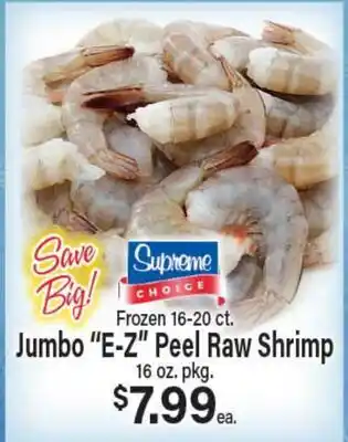This offer is available in various stores, view all products to get the cheapest Frozen 16-20 ct. Jumbo E-Z Peel Raw Shrimp. If you'd like to find out whether this product has a bigger discount in another store, check the category 'Grocery'. You may also find these offers interesting: Frozen 41-50 ct. E-Z Peel Raw Shrimp, 16/20 ct Easy Peel Raw or 31/40 ct Cooked Shrimp & Jumbo Raw Shrimp.