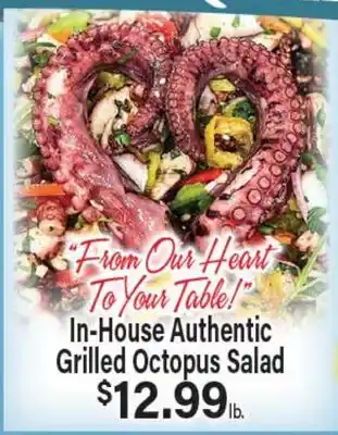 The price of In-House Authentic Grilled Octopus Salad can be found at the top of the page, together with the dates during which the offer is available. You can also check the price in the current weekly ad or on the Angelo Caputo's Fresh Market website. Promotional offers assure you of buying Angelo Caputo's Fresh Market products at the lowest price.
