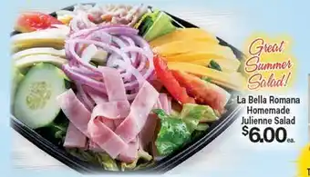 The price of La Bella Romana Homemade Julienne Salad can be found at the top of the page, together with the dates during which the offer is available. You can also check the price in the current weekly ad or on the Angelo Caputo's Fresh Market website. Promotional offers assure you of buying Angelo Caputo's Fresh Market products at the lowest price.