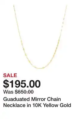 This offer is available in various stores, view all products to get the cheapest Guaduated Mirror Chain Necklace in 10K Yellow Gold. If you'd like to find out whether this product has a bigger discount in another store, check the category 'Department Stores'. You may also find these offers interesting: Flower Mirror Chain Necklace in 10K Yellow Gold, 24kt Yellow Gold Rope Chain & 14kt Yellow Gold Bismark Necklace.