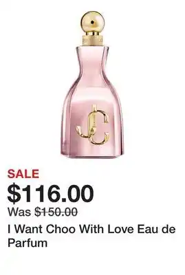This offer is available in various stores, view all products to get the cheapest I Want Choo With Love Eau de Parfum. If you'd like to find out whether this product has a bigger discount in another store, check the category 'Department Stores'. You may also find these offers interesting: Perfect Eau de Parfum, Forever Cherry Blossom Eau De Parfum & Sweet Treat Sundae Eau De Parfum 3.4oz.