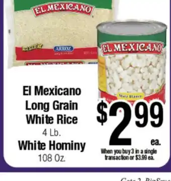 El Mexicano Long Grain White Rice 4 Lb. White Hominy 108 Oz Discount at Big Saver Foods