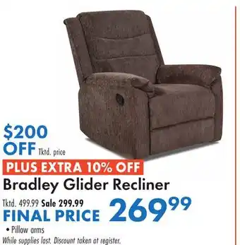 This offer is available in various stores, view all products to get the cheapest Bradley Glider Recliner. If you'd like to find out whether this product has a bigger discount in another store, check the category 'Department Stores'. You may also find these offers interesting: Glider Recliner, Rocking Recliner & JUMBO RECLINER.