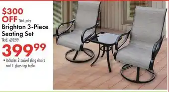 This offer is available in various stores, view all products to get the cheapest Brighton 3-Piece Seating Set. If you'd like to find out whether this product has a bigger discount in another store, check the category 'Department Stores'. You may also find these offers interesting: 4-Piece Resin Wicker Deep Seating Set, SunVilla Aldous 4-piece Outdoor Patio Seating Set & Crystal River Rust-Resistant Aluminum 3-Piece Seating Set.
