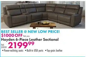 In which store will Hayden 6-Piece Leather Sectional be on sale next week? These are some of the questions we get asked a lot. It’s only normal, nobody likes to pay too much! Our team keeps an eye on all deals and lists them online as soon as possible. So you can customize your (shopping) list with this week's offers and those of next week. Make sure to check next week’s Boscov's ad, some of the specials are only available next week or online.Frequently asked questions about Hayden 6-Piece Leather Sectional