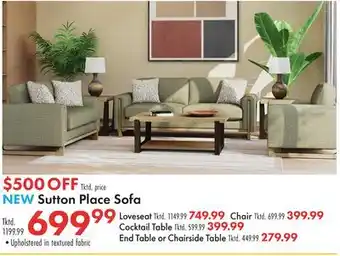 The price of Sutton Place Sofa can be found at the top of the page, together with the dates during which the offer is available. You can also check the price in the current weekly ad or on the Boscov's website. Promotional offers assure you of buying Boscov's products at the lowest price.