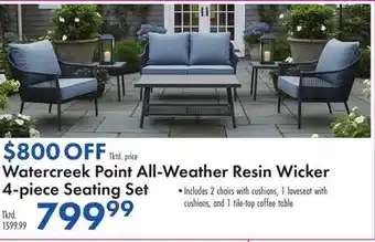 This Watercreek Point All-Weather Resin Wicker 4-piece Seating Set is available in the following branches based on your set location: