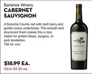 The price of Banshee Winery CABERNET SAUVIGNON can be found at the top of the page, together with the dates during which the offer is available. You can also check the price in the current weekly ad or on the Bristol Farms website. Promotional offers assure you of buying Bristol Farms products at the lowest price.