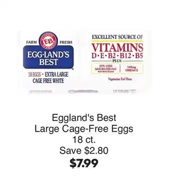 This offer is available in various stores, view all products to get the cheapest Eggland's Best Large Cage-Free Eggs. If you'd like to find out whether this product has a bigger discount in another store, check the category 'Grocery'. You may also find these offers interesting: Eggland's Best Cage Free Large Eggs, Eggland's Best large eggs & Eggland's Best Eggs.