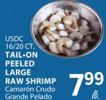 This offer is available in various stores, view all products to get the cheapest USDC 16/20 CT. TAIL•ON PEELED LARGE RAW SHRIMP. If you'd like to find out whether this product has a bigger discount in another store, check the category 'Grocery'. You may also find these offers interesting: 2 lb. bag 21-25 ct. Tail-On RAW SHRIMP, India Farmed 21-25 ct. Peeled & Deveined Raw Shrimp & Peeled & Deveined Shrimp Tail Off.