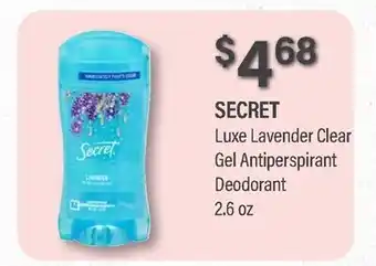 In which store will SECRET Luxe Lavender Clear Gel Antiperspirant Deodorant be on sale next week? These are some of the questions we get asked a lot. It’s only normal, nobody likes to pay too much! Our team keeps an eye on all deals and lists them online as soon as possible. So you can customize your (shopping) list with this week's offers and those of next week. Make sure to check next week’s Commissary ad, some of the specials are only available next week or online.Frequently asked questions about SECRET Luxe Lavender Clear Gel Antiperspirant Deodorant