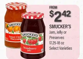 This offer is available in various stores, view all products to get the cheapest SMUCKER'S Jam, Jelly or Preserves. If you'd like to find out whether this product has a bigger discount in another store, check the category 'Grocery'. You may also find these offers interesting: Smucker's Squeeze Jam or Jelly, Signature SELECT Preserves, Jelly or Marmalade & Signature SELECT Preserves, Jelly or Marmalade.