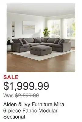 This Aiden & Ivy Furniture Mira 6-piece Fabric Modular Sectional is now on deal at Costco. All information about current prices, promotional conditions, and durations can be found on this page. Also check out other comparable deals and promotions related to Aiden & Ivy Furniture Mira 6-piece Fabric Modular Sectional, so you can always make the most cost-effective choice.The duration of the Aiden & Ivy Furniture Mira 6-piece Fabric Modular Sectional deal is from 23-02-2026 to 01-03-2026. If the deal is no longer valid, you can look at other comparable offers. You can also follow the product category to stay informed as soon as Aiden & Ivy Furniture Mira 6-piece Fabric Modular Sectional is on deal again at Costco. By comparing Aiden & Ivy Furniture Mira 6-piece Fabric Modular Sectional deals, you'll know whether it's wise to wait on a purchase because it might have been cheaper or might come up cheaper in a future deal. So keep an eye on our site to see if Aiden & Ivy Furniture Mira 6-piece Fabric Modular Sectional appears next week with a significant discount in the flyer.